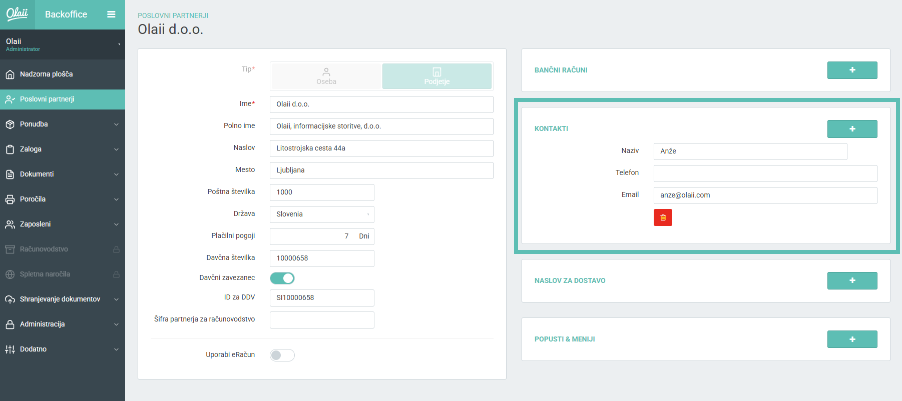 V levem meniju pod “Poslovni partnerji” s klikom na gumb “+” začnemo z dodajanjem novega partnerja ali pa s klikom na ikono svinčnika uredimo obstoječega. V obeh primerih se nam odpre okno, ki je prikazano na spodnji sliki. Tukaj poleg podatkov partnerja, na desni strani najdemo okno “Kontakti“, s klikom na “+” lahko dodamo novo kontaktno osebo, ki bo prejemala račune na e-mail, ki ga bomo vnesli v obrazec. V polje “Naziv” lahko vnesemo zgolj ime, ki bo služilo interno in ne bo prikazano v e-mail sporočilih. Dodamo lahko tudi več kontaktnih oseb, s ponovnim klikom na “+“. Vnesene kontakte in spremembe potrdimo s klikom na “Shrani” v desnem spodjem kotu.